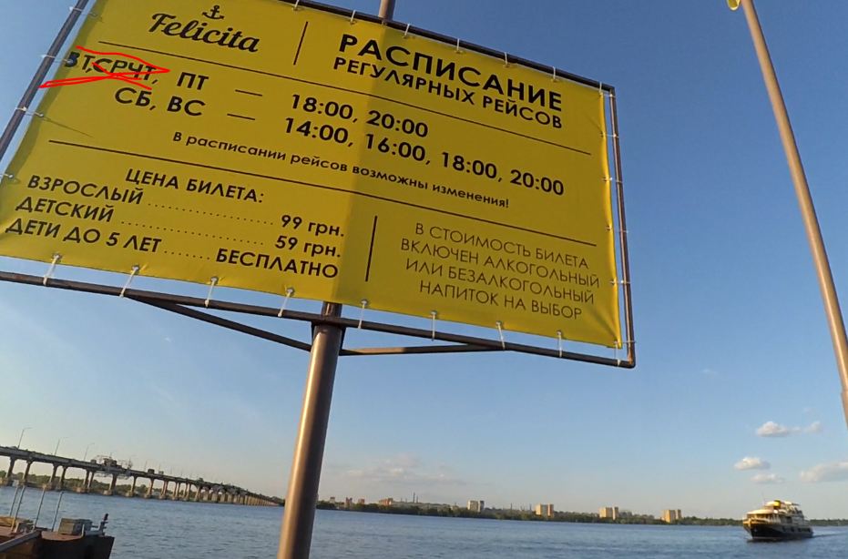 - место за столиком в главном салоне или на открытых палубах во время движения теплохода по расписанию: 120 грн. в час для взрослого, 70 — детский (дети до 5 лет — бесплатно).